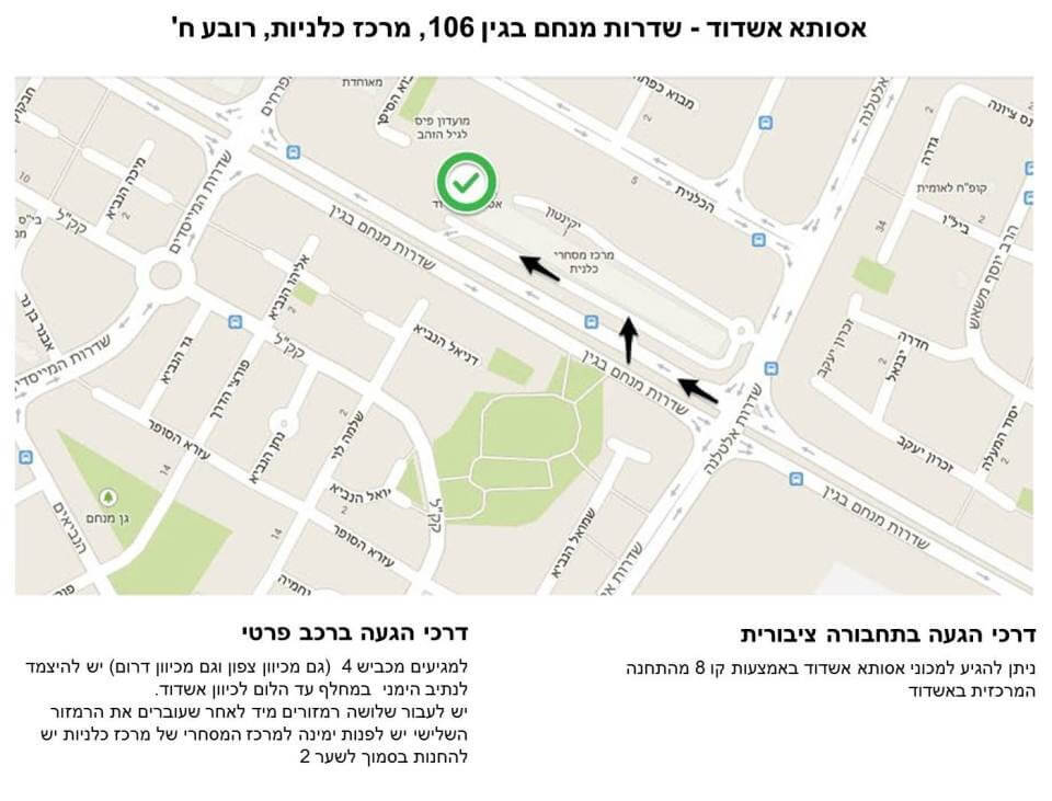 הניתוחים מתבצעים במרכז אסותא אשדוד, מרכז כלניות. (המפה מצורפת) ניתן להתקשר לזימון תורים ולמידע בטלפון 08-8546333