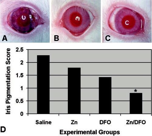 In the present study, we have demonstrated that topical application of low concentrations of Zn/DFO or Ga/DFO, after corneal exposure to NM, markedly reduced conjunctival, cor-neal, iris, and anterior chamber injury. In the cornea, faster healing of epithelial erosions, reduced long-term opacification and lower levels of neovascularization were observed. In the anterior chamber, decreased inflammation and better mainte-nance of IOP was achieved. Iris pigmentation and atrophy were not as severe, with less posterior adhesions of the iris to the lens. Cataractous changes were also notably milder.